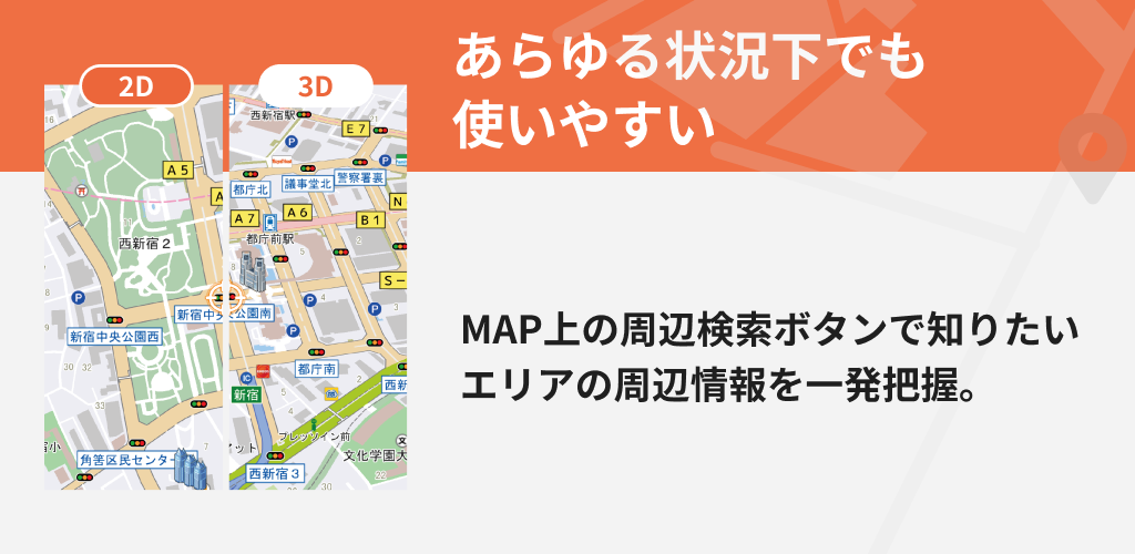 ・Je kunt in één keer naar allerlei plekken in de buurt van je huidige locatie zoeken, zoals stations, bushaltes, buurtwinkels en restaurants, door je zoekopdracht te verfijnen met elk genre of een vrij woord!