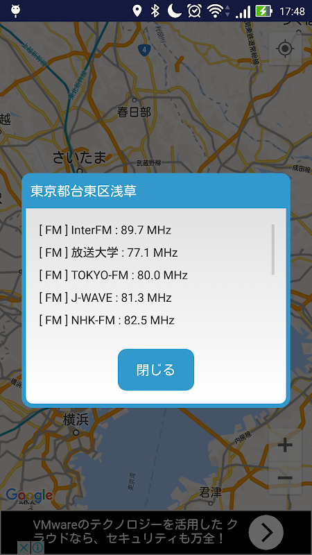 アプリを起動するとGPSを使用して現在地で聴取可能なラジオ局の周波数を一覧表示します。