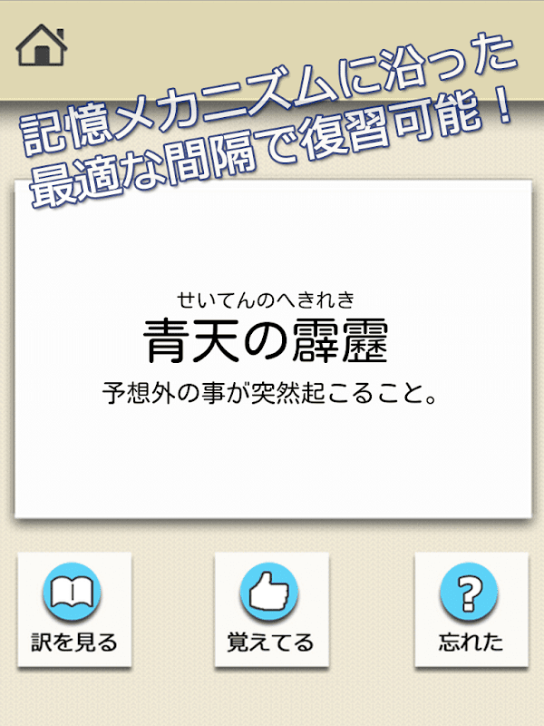暗記カードのように、最初は問題として、ことわざ、四文字熟語、慣用句、故事成語のいずれかが表示されます。