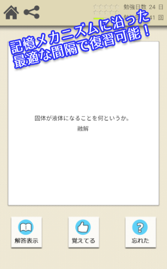 暗記には繰り返しの復習がとても重要ですが、このアプリは覚えていない問題を何度も繰り返し出題するようになっているため、勉強を進めていくだけでしっかりと覚えることができるようになっています。