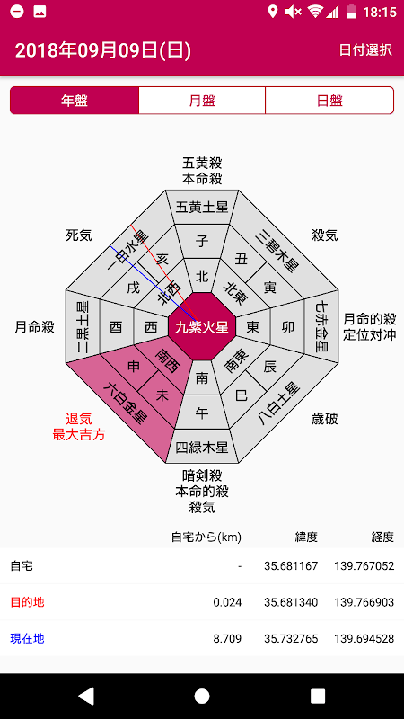 九星気学に基づき吉方位/凶方位を調べるアプリです。