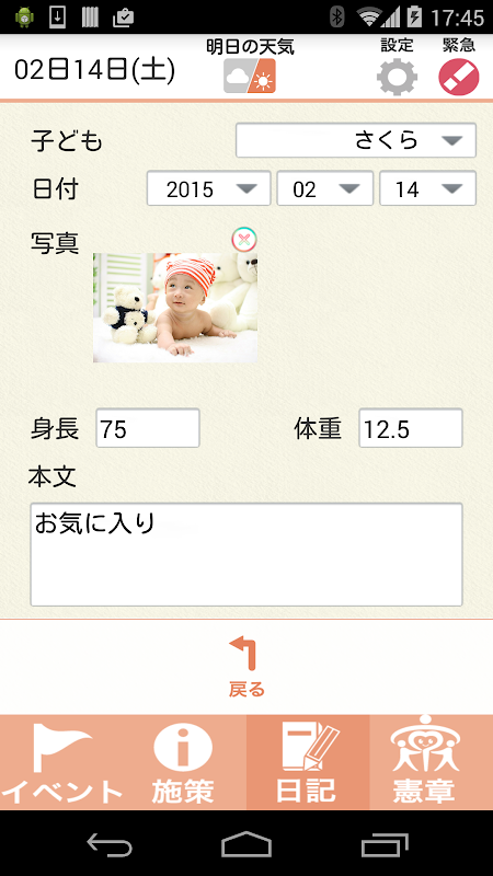 記録した日記を時系列で表示し,身長・体重をグラフ化して表示します。また,記録