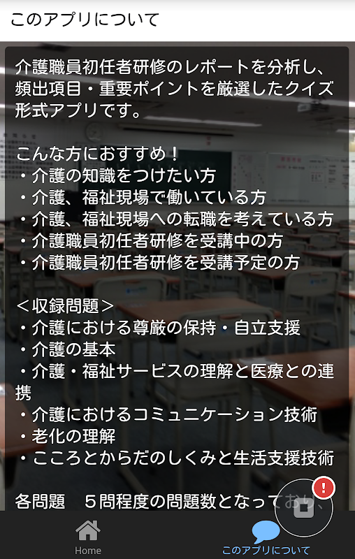 介護職員初任者研修のレポートを分析し、頻出項目・重要ポイントを厳選したクイズ形式アプリです。介護職員初任者研修を受講中の方や受講予定の方におすすめです!