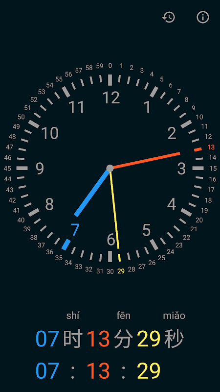 可以清晰的看到时针(蓝色),分针(红色),秒针(黄色)是如何转动并计时的。