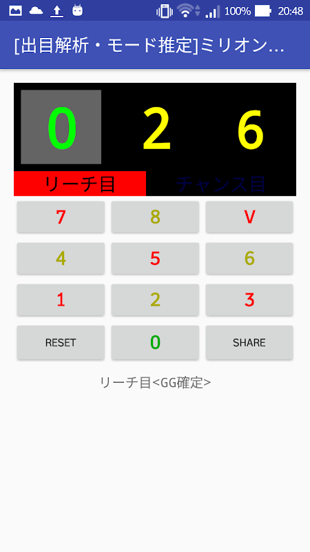 スロット「ミリオンゴッド-神々の凱旋-」のリーチ目、チャンス目、滞在モード推定アプリです。出目をタッチで入力するだけの簡単操作。