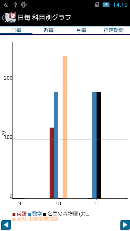 Tik op het staafdiagrampictogram op de maandkalender om de studietijd voor elk onderwerp in een staafdiagram weer te geven.