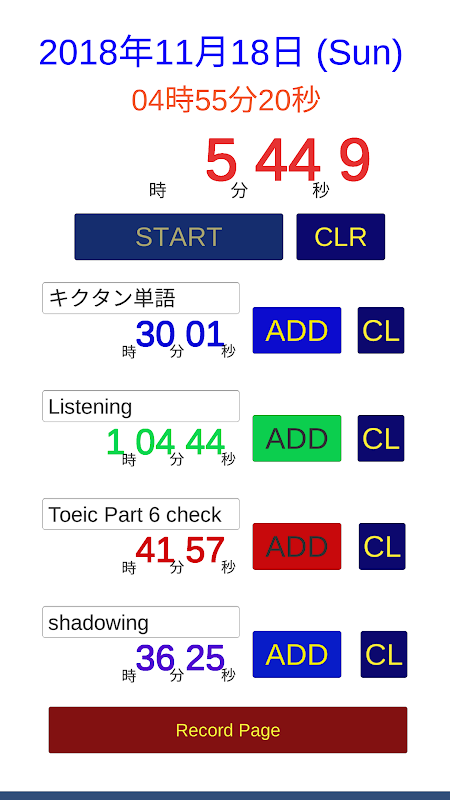 毎日、自分が各項目について、どれくらい勉強(練習)したかをチェックするための積算時間記録アプリです。項目名は4つあり、それぞれの積算時間をチェックできます。