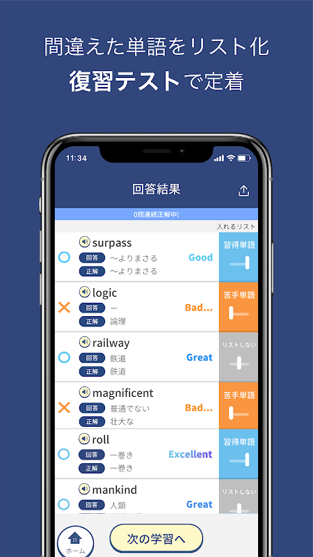 Verkeerde woorden worden automatisch vermeld. Uit de lijst kunt u woorden leren waar u niet goed in bent! Ik ben niet goed in het samenvatten in de review-test → Leren!