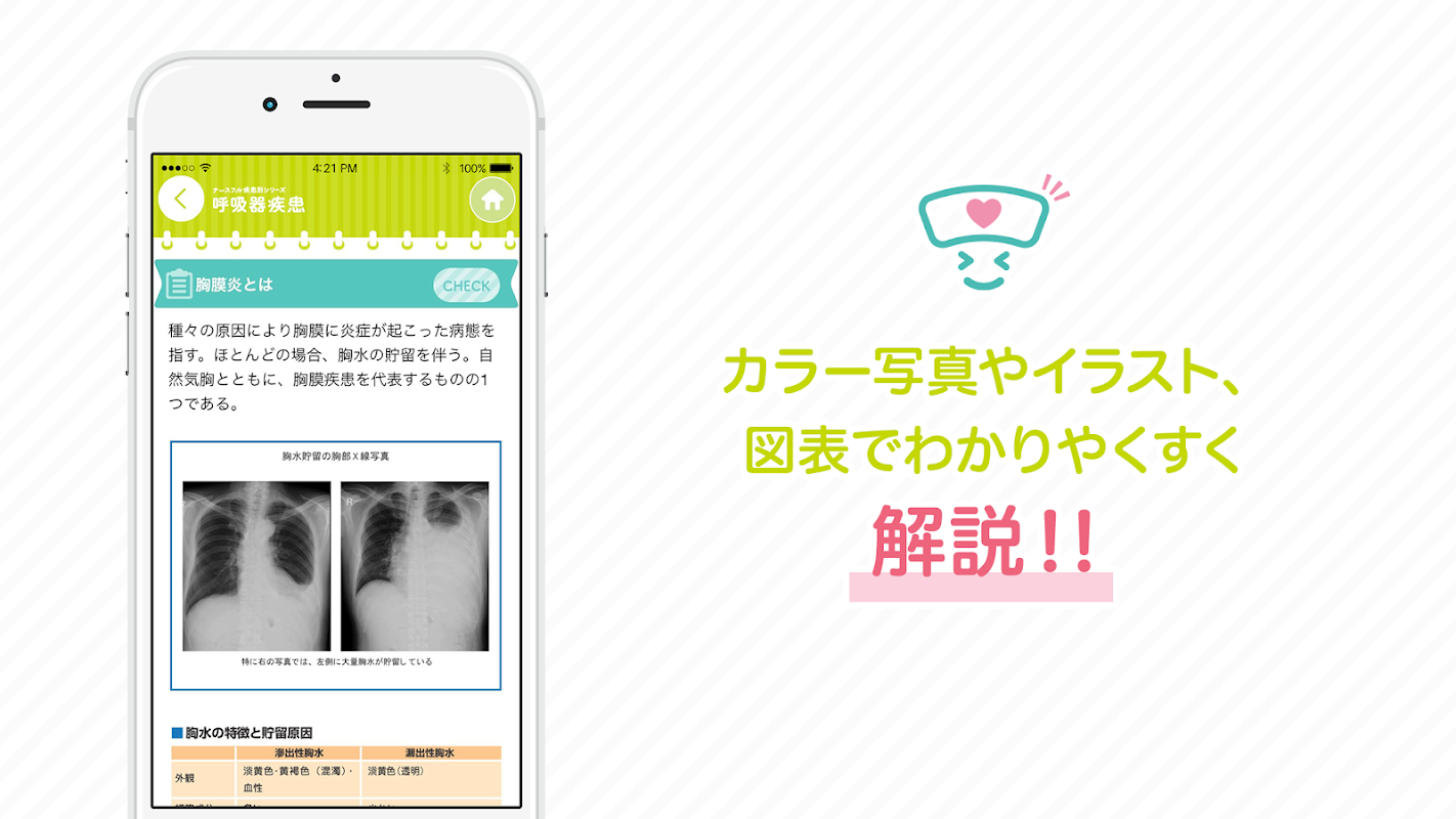 患者に接する機会が最も多い看護師さんの視点で書かれた「いちから学べる看護師必携アプリ」です。