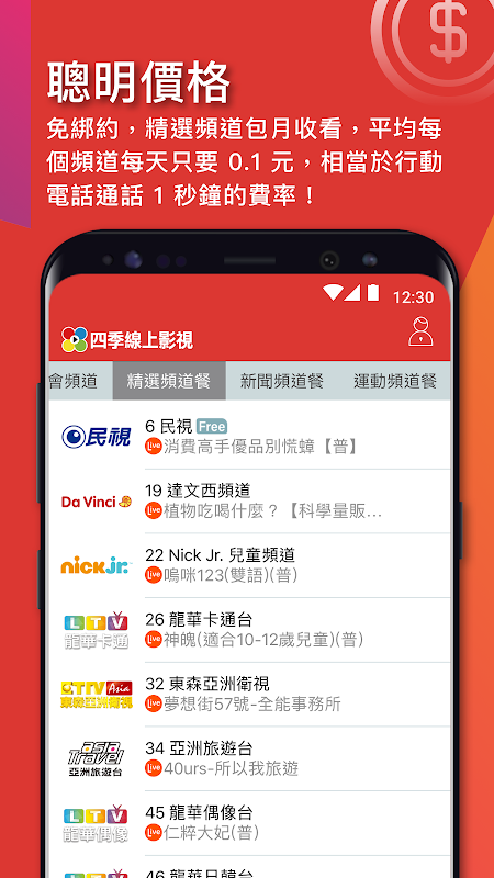 免綁約,精選頻道包月收看,平均每個頻道每天只要 0.1 元,相當於行動電話通話 1 秒鐘的費率!