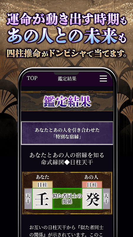 Vanaf de datum en tijd van je geboorte kun je je lot, lot en gevoelens beheersen met behulp van de imperiale wetenschap ‘Vier Pijlers van het Lot’. Geniet alsjeblieft van de wijsheid van waarzeggerij door de "hit" onder de knie te krijgen.