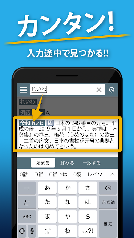 Voer gewoon een deel van het woord in en de betekenis en de tekst die u wilt opzoeken, worden direct weergegeven!
