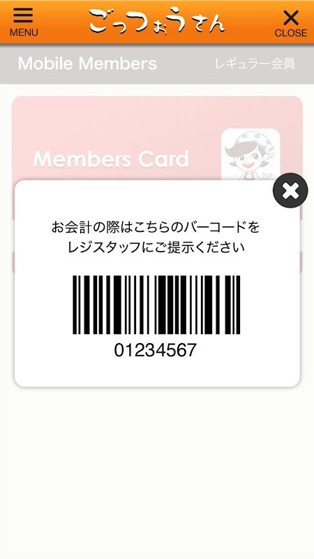 「会員番号バーコード」の表示機能は、店頭で提示することで、スムーズな会計が可能です。