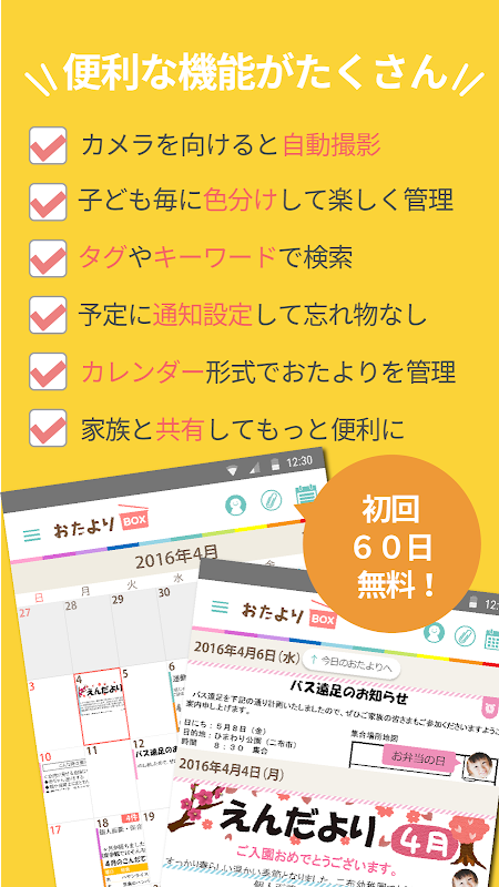 ・子どもの保育園や幼稚園の入園、小学校の入学にあわせておたよりBOXをインストールしておくと、入園直後の大量のプリント嵐も大丈夫!