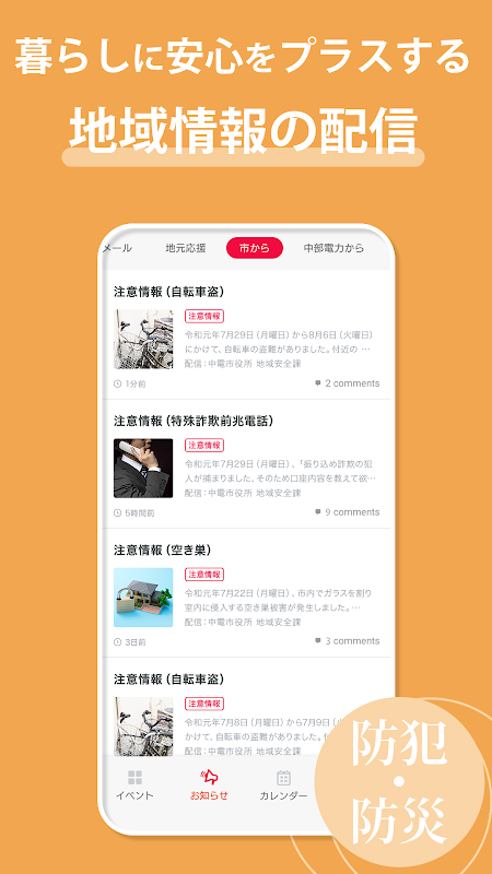 配信される防犯や防災、子育てなどの情報は、お住まいの地域に絞り込んで配信。