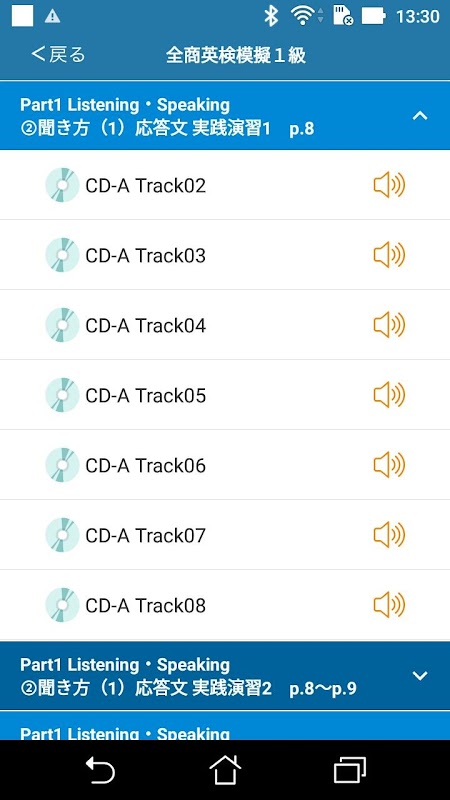 ②ダウンロードが完了後、「聴く」をクリックすると、リスニング問題の情報が表示されます。右端の∨をクリックすると、トラックナンバーが表示されます。