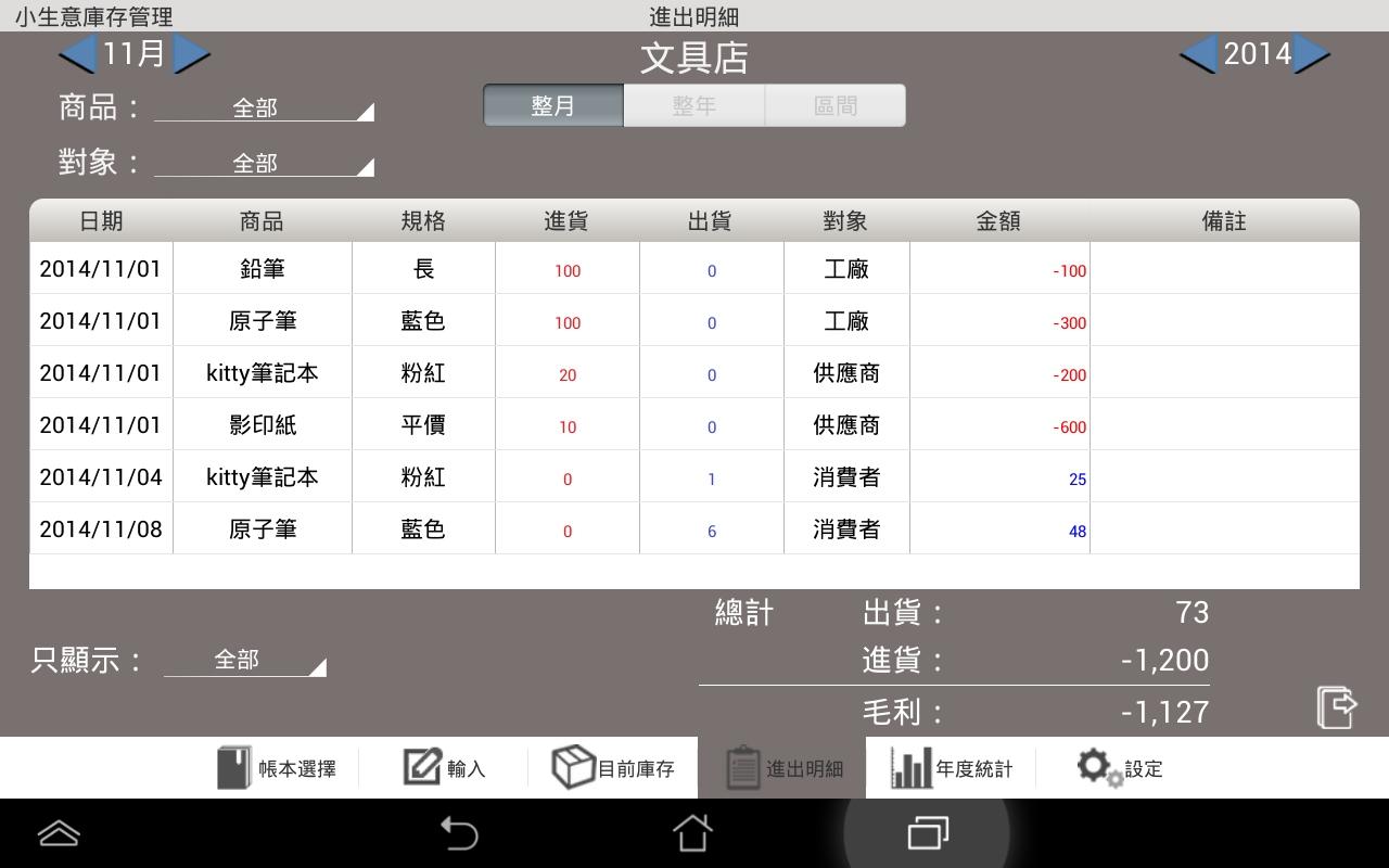 。「進出明細」:可以根據進出貨對象,查看整月份或整年度的明細。