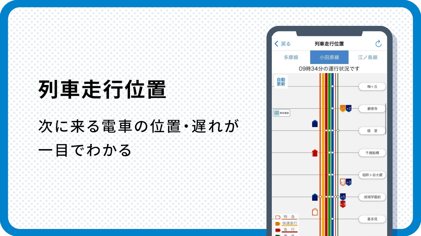 Realtime melding van bedrijfsinformatie zoals treinrijpositie, vertrektijd en congestievoorspelling voor de Odakyu-lijn! Verder zie je in één oogopslag de rijpositie en het model van de romance car!