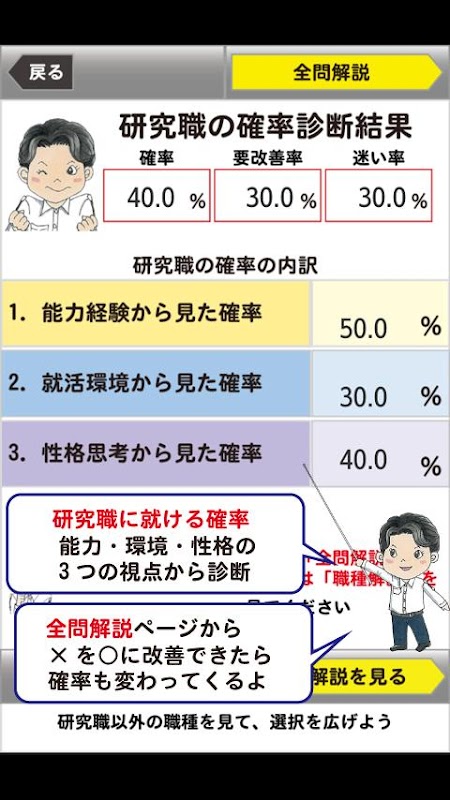 能力経験/就活環境/性格思考の3つの視点から研究職に就ける可能性を判定します。