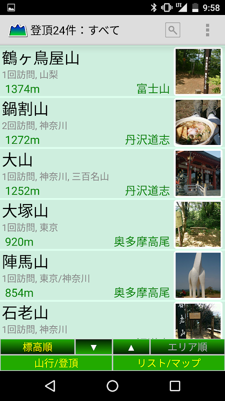 ▼山行の記録や登頂の記録の一覧をリストや地図上に写真付きで表示します。