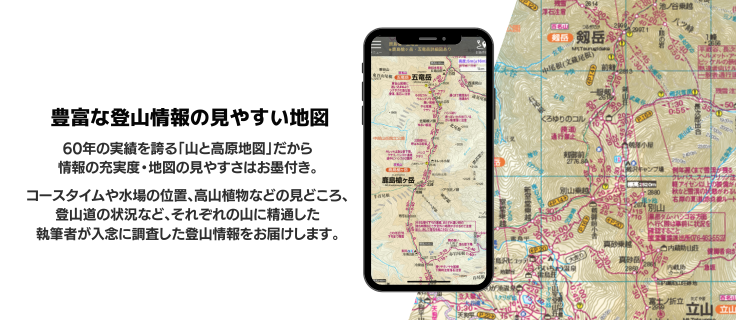 Omdat het een 'berg- en plateaukaart' is met een geschiedenis van 60 jaar, is de garantie gegarandeerd dat de informatie compleet is en dat de kaarten gemakkelijk te lezen zijn. We bieden informatie over bergbeklimmen die zorgvuldig is onderzocht door auteurs die bekend zijn met elke berg, inclusief parcourstijden, locaties van waterpoelen, hoogtepunten zoals alpenplanten en omstandigheden op de bergpaden.