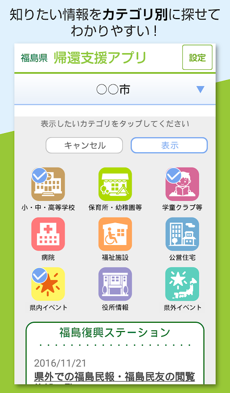 このアプリは福島県が提供するアプリです。アプリは、避難地域と避難者の受け入れや自主避難者の多い市町村の住民の方へ、帰還を支援する情報やふるさとの情報を伝えます。