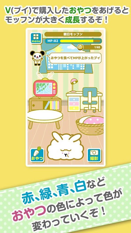 モッフンを育てる中で貯まったV(ブイ)やMP(モフモフポイント)でおやつなどのアイテムの購入が出来ます。