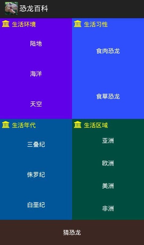 1、将恐龙按照生活环境、习性、年代、区域进行分门别类,方便查询。