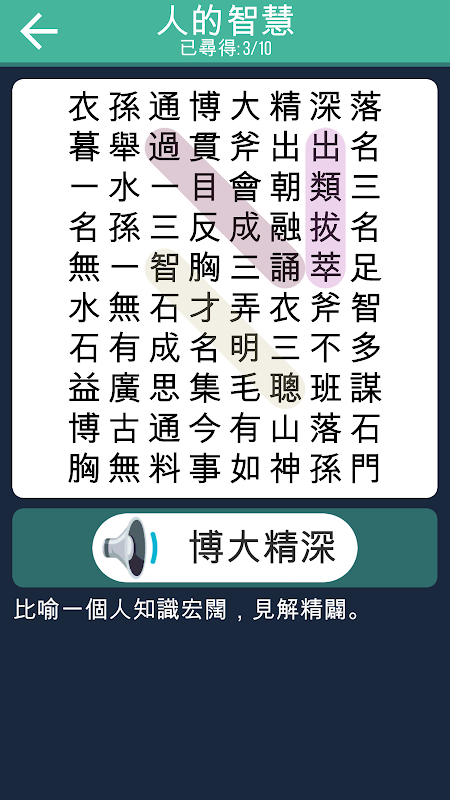 De gameplay van de traditionele modus is vergelijkbaar met het algemene woordzoekspel: spelers hoeven alleen alle weergegeven idiomen in de traditionele Chinese karakterlay-out te vinden. Er zijn drie moeilijkheidsgraden in het spel, die de grootte van de lay-out kunnen bepalen, maar de inhoud van het leren is precies hetzelfde. Elk idioom wordt in het spel uitgelegd en u hoeft het woordenboek van idiomen niet te raadplegen, zodat u kunt genieten van het plezier van zoeken en ontdekken. Bovendien zijn er idioomuitspraken in het spel, dus u hoeft zich geen zorgen te maken dat u idioom verkeerd uitspreekt.