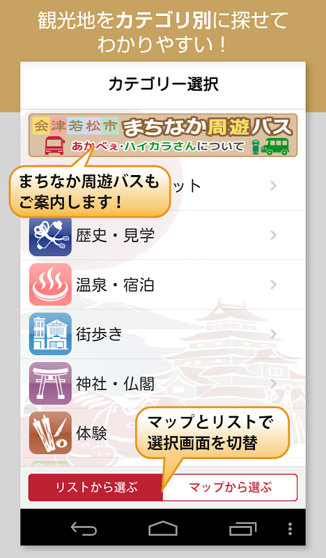 会津若松市まちなか周遊バス「あかべぇ・ハイカラさん」を利用したナビができます。