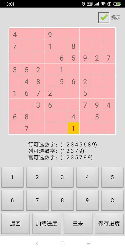 Drie moeilijkheidsgraden, Sudoku met hints en bespaar vooruitgang.