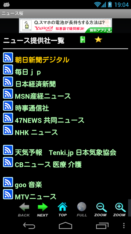 新聞社など56社がHP発信する最新ニュースをサクサク読める、コンパクトに拡大縮小表示。好みのニュースをメニュー選択し閲覧、ブックマーク機能、追加・削除・編集。