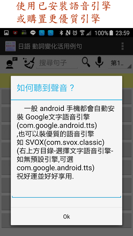 日語動詞原型 49 個 , 每個原型所有變化 381 段 ,共 4284 句 中日語皆可發音(透過文字轉語音引擎),爾後還會繼續增修.