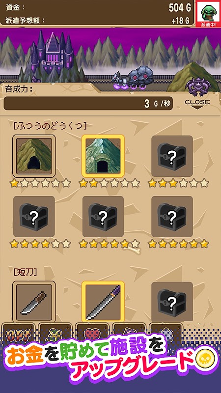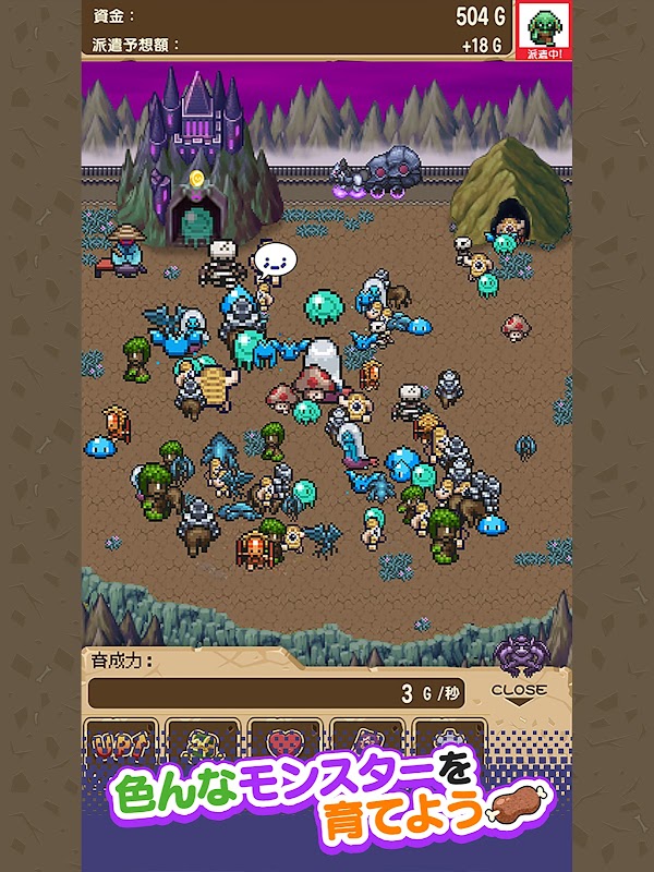 Breng de monsters die uit de grot komen groot door ze aan te raken en te voeren, laat ze het kasteel van de demonenkoning binnengaan en tik op de koets om ze naar de kerker te sturen!