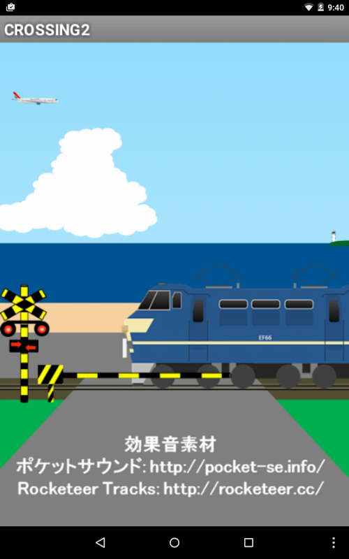 Deze applicatie is gebaseerd op het beeld van een spoorwegovergang nabij het strand wanneer het geluid van de golven weerklinkt. Verschillende treinen passeren.