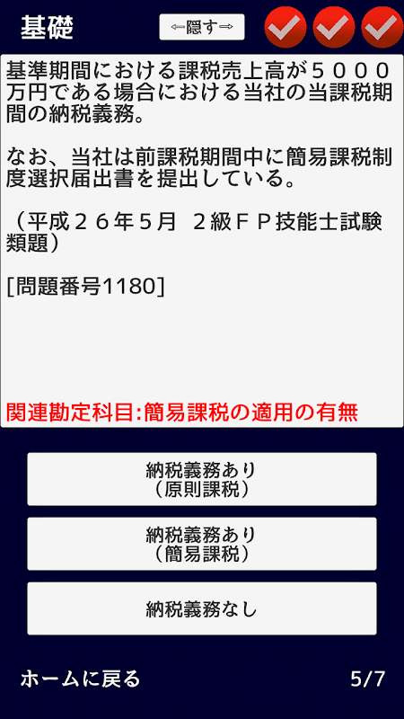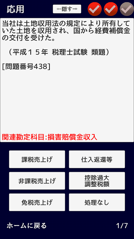 Zoals vermeld in ``Hoe de app te gebruiken'' op het startscherm, zijn de vragen in deze app vergelijkbaar met die in het examen voor de belastingaccountant. We hebben correcte antwoorden voorbereid op basis van de voorwaarde om 'de methode te kiezen die het aantal vermindert van vragen." Als het dus voordeliger is om bij de berekening van het belastingbedrag voor de huidige periode uitzonderingen toe te passen (bepalingen die ~ toestaan) in plaats van de algemene regels voor een bepaalde transactie, is het juiste antwoord het gebruik van de uitzonderingen. Los de problemen op op basis van de vereisten vermeld in "Hoe de app te gebruiken" op het startscherm.