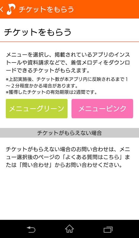 アプリダウンロード等で、着メロ(着信メロディ)・着信音を無料ダウンロードできる権利(チケット)をゲットして、14万曲の着メロの中から好きな曲をダウンロードできるサービスです。