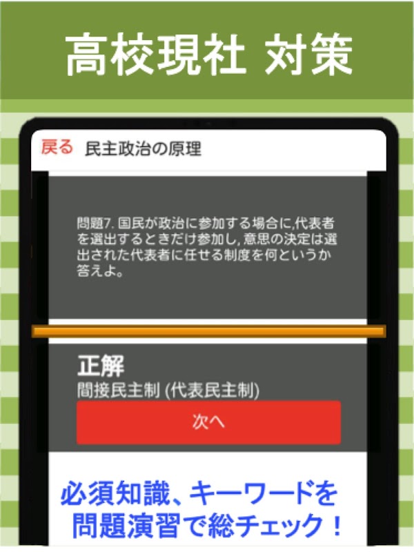 高校 公民「現社」に関する大量の知識をアプリで克服!授業の復習用からセンター試験まで、合格に必要な知識問題を厳選!知識の総チェック&弱点克服に最適です!