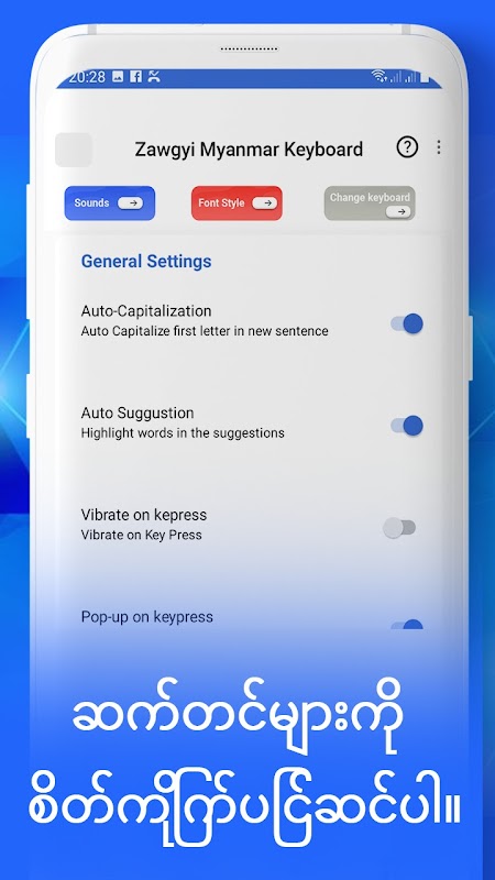 zawgyi Myanmar-toetsenbord met Myanmar-stem Typen Thema's, Emoji, Vertaler
