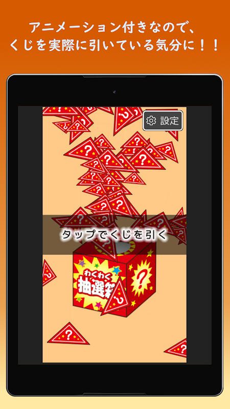 Een loterij app die gebruikt kan worden op evenementen! Het plezier wordt verbeterd met de animatie en het geluid van de loterijdansen! Het instellen van de loterij is eenvoudig en het heeft ook een functie voor ongevallenpreventie waarmee u de instelling kunt zien.