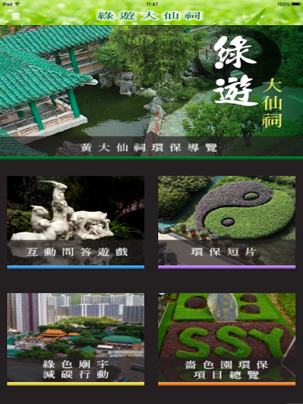 嗇色園「綠遊大仙祠」手機應用程式,透過互動遊戲及多媒體元素,向市民介紹兩項嗇色園重點環保項目:「煙香減少及除味系統」及「從心苑生態徑」。
