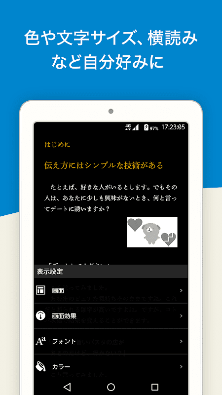 ・Je kunt de tekst vrijelijk vergroten, de achtergrondkleur wijzigen en de tekst verticaal/horizontaal of in kolommen weergeven.