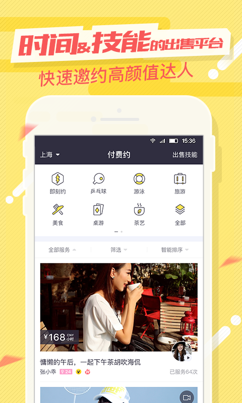目前提供生活娱乐、业余导游和专业行家咨询等品类,包括音乐助教、喝茶聊天、同城约饭、模特约拍、羽毛球、桌球、健身、陪跑、绿茵宝贝、口语交流、心理咨询等服务。