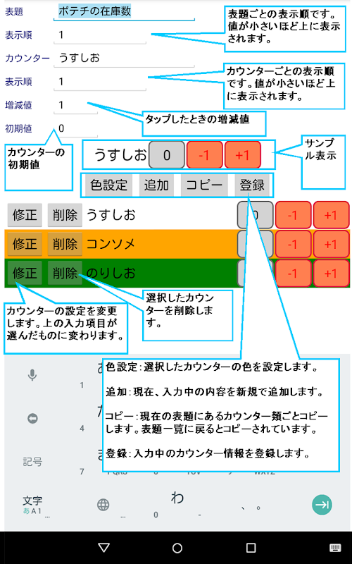 カウンターを項目別に複数作成できるマルチカウンターアプリです。 増減値や文字、背景色やボタン色まで細かく設定できます。 CSVデータ出力もできます。