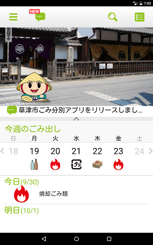 収集日変更のお知らせやイベント情報などを確認することができます。