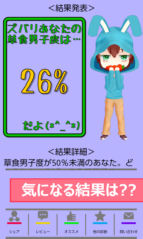 このアプリはランダムに出題される15問の心理テスに答えるだけで、その人の草食男子度を測定しちゃおうという、まぁ、ありそうで、なさそうな、いや、あるかな?まぁ、そんな診断ゲームアプリとなっております。