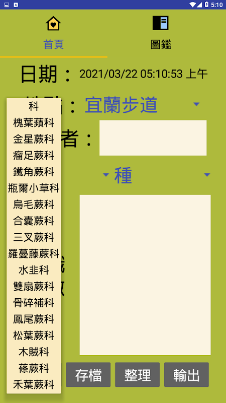1. Stel de observatieplaats in volgens de Yilan Trail in Taiwan en leg de identificatiekenmerken van verschillende varens in woorden vast. Gebruik CSV-bestanden als een offline database om situaties te vermijden waarin er geen netwerk in het wild is. Het is ook mogelijk om het bestand te exporteren en te bewerken met een computerspreadsheet.