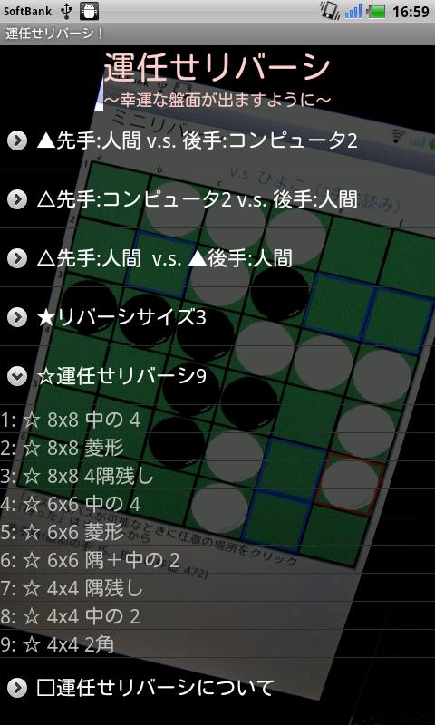 盤面サイズは 6x6 のミニリバーシとさらに小さい 4x4 のマイクロリバーシ、普通サイズの 8x8 の盤面が選べます。