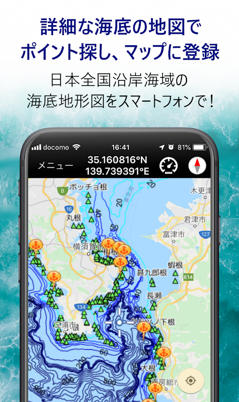 釣りナビくん 海底地図にポイント登録、GPSでナビ
