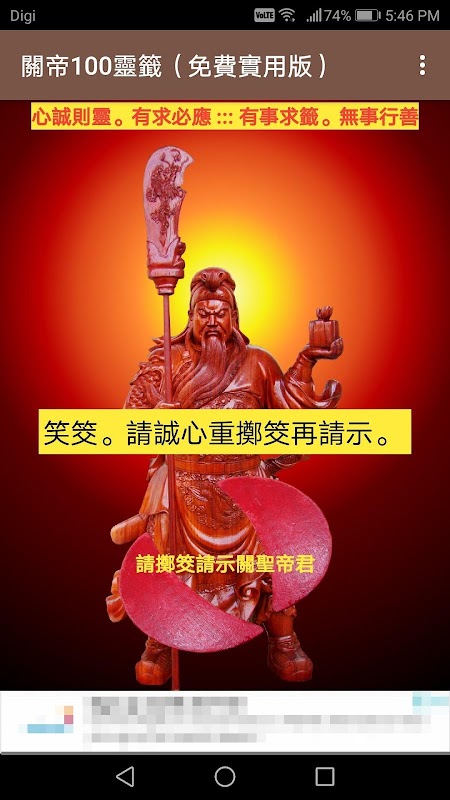 忠義人士第一選擇的《關帝100靈籤》。用此應用程式,可隨時隨地求籤解惑,趨吉避凶。有求必應,心誠則靈。